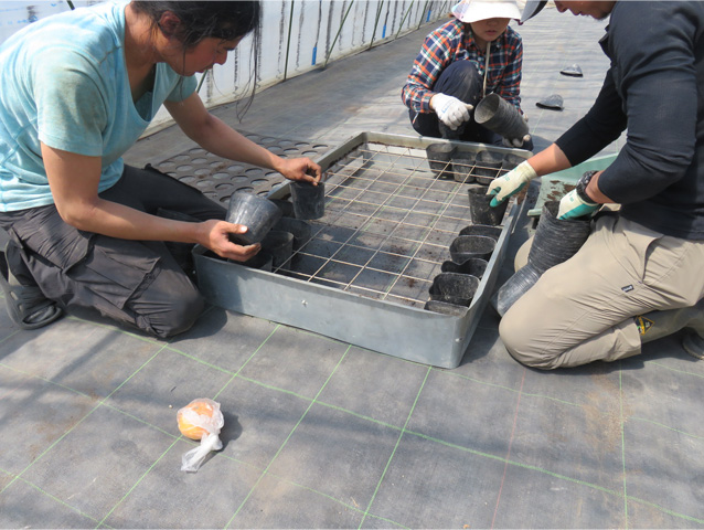 専用の枠にひとつずつポットをはめ込み、土を入れ、木のヘラでならします